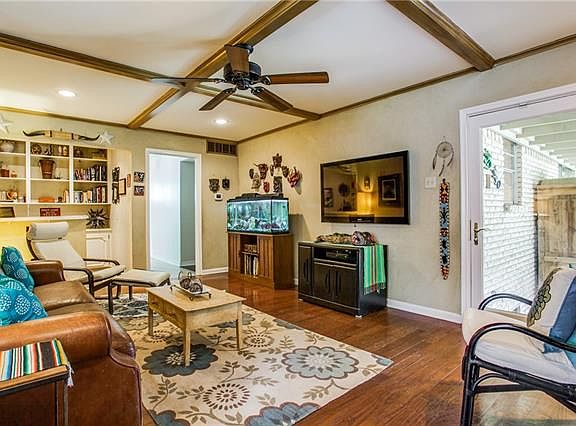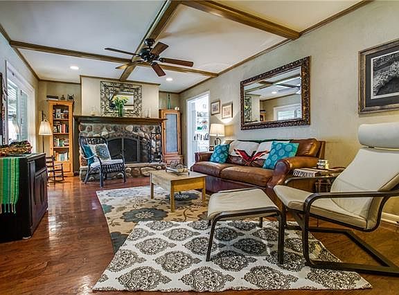 New HVAC, paint in & out plus roof. Traditional East Dallas home, engineered hardwood floors & tile, 2 front bedrooms with jack & jill bath, wood paneling in den with WBFP & door to large, covered patio. Galley kitchen. Master has dressing area. 8'' fence-rolling gate, private backyard with landscaping. Front features a circle drive & more landscaping. Gutters. Garage is finished out. Includes fridge. $7500 seller allowance for updates.