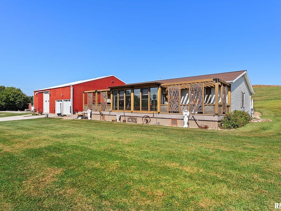 This isn't just a home. It's a lifestyle, a gathering place, a one-of-a-kind retreat you may never find again. Welcome to five acres of pure possibility just north of Aledo, tucked at the end of a quiet, paved dead-end road where country calm meets jaw-dropping amenities. Let's start with the showpiece: a 60x60x16 insulated, heated pole barn/garage that's basically a dream factory. Full bath. Office, hunting or tack room. A mechanic's hoist. Loft areas for storage. And if that's not enough, a lean-to out back tall enough for your RV, plus additional outbuildings for storage But wait, it gets even better. This property comes with its own campground. Yes, you read that right. Eleven+ full hookups with water, sewer, and electric. A playground. A homemade putt-putt course. A grain bin/ fire pit gathering spot. Imagine weekends where your friends and family roll in with campers, laughter filling the air, and everyone making memories without ever leaving home. The house? Upgraded and expanded. A wraparound vinyl deck spans the front, with an enclosed cedar sunroom that's all charm. Out back, a family room addition means even more space. Inside, the main floor flows open from kitchen to dining-living, plus three bedrooms. The basement is finished with a rec room (pool table included), family room, two non-conforming bedrooms, and storage galore. So many upgrades!!