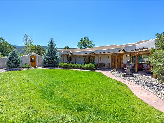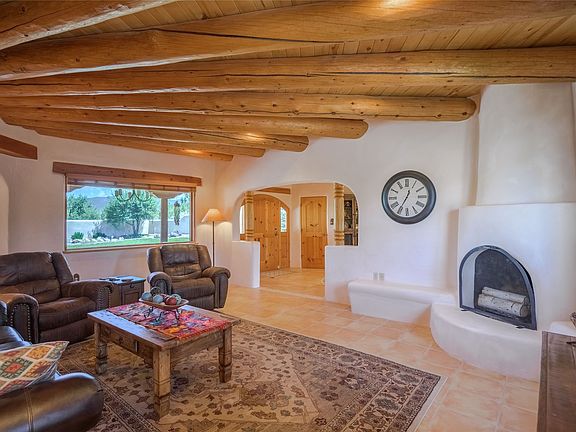 You’ll love the striking entry gate welcoming you to the idyllic, walled grounds with Taos Mtn. views and a wraparound portal for enjoying both. You’ll love the impeccably maintained 3BR/2.5BA/3CG, 2,250 sq. ft. pueblo style home+ 400 sq. ft. attached studio/workshop on 1 ac. in the desirable Weimer area. What’s not to love about the warm wood accents like viged ceilings, the hand troweled interior diamond finish plaster, or the two kiva fireplaces? The living room will please with its unique high ceilings with vigas in a spoke design, corner FP, and impressive mountain view. Another corner kiva FP highlights the primary bedroom with walk-in and spa like bath. The kitchen was totally updated with granite, stainless, and lots of cabinets and the adjoining generous dining area ideal for making memories or starting traditions. Relax under the portals in back and enjoy a refreshment, read a book, or bring on the bar-b-que. This home makes entertaining easy. Drip irrigation makes it easy to baby