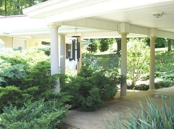 Brick and vinyl rand in quiet neighborhood, large garden area, lots of landscaping, covered walkways and porch. Out building and two car garage. Monitor heater.