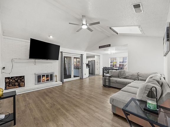 Enjoy cozy evenings by the wood-burning fireplace in the main living area, highlighted by two large skylights that flood the space with natural light. The split-bedroom layout offers added privacy, with the primary suite featuring double vanities, a spacious walk-in closet, and a relaxing retreat away from the secondary bedrooms.