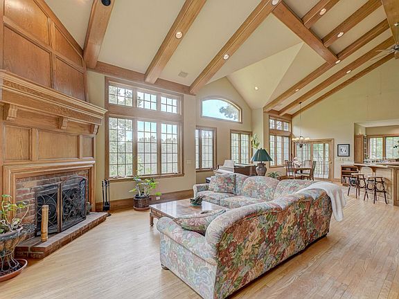 Escape to your 5 acre sanctuary with gorgeous wooded views, peace and privacy! Once a celebrated Parade of Homes model, this custom-built executive retreat marries soft contemporary design with the timeless charm of an English countryside manor. Step inside to be greeted by soaring 18-foot vaulted & beamed ceilings, walls of windows, and exquisite custom millwork showing craftsmanship in every corner. The main-level primary suite offers an escape of its own, with a spacious walk-in closet and serene views. A second junior suite with a private bath provides luxurious comfort for guests or family. Lose yourself in the magic of the home’s library, where a ladder leads you to a wall of books waiting to be explored. The heart of the home—the gourmet kitchen—features a rare AGA stove and copper-faced refrigerator & prep sink, while the Butler’s pantry and wet bar invite effortless entertaining. Sip morning coffee or unwind at dusk on the screen porch or on the private deck, surrounded by towering pines, wandering wildlife, and sweeping hilltop views. The walkout lower level offers a generous home office and the potential to create more finished space—unlocking both instant equity and room to grow. Loved by its original owner, this home is a masterpiece of warmth and wonder—waiting for your modern touches to bring the next chapter to life!
