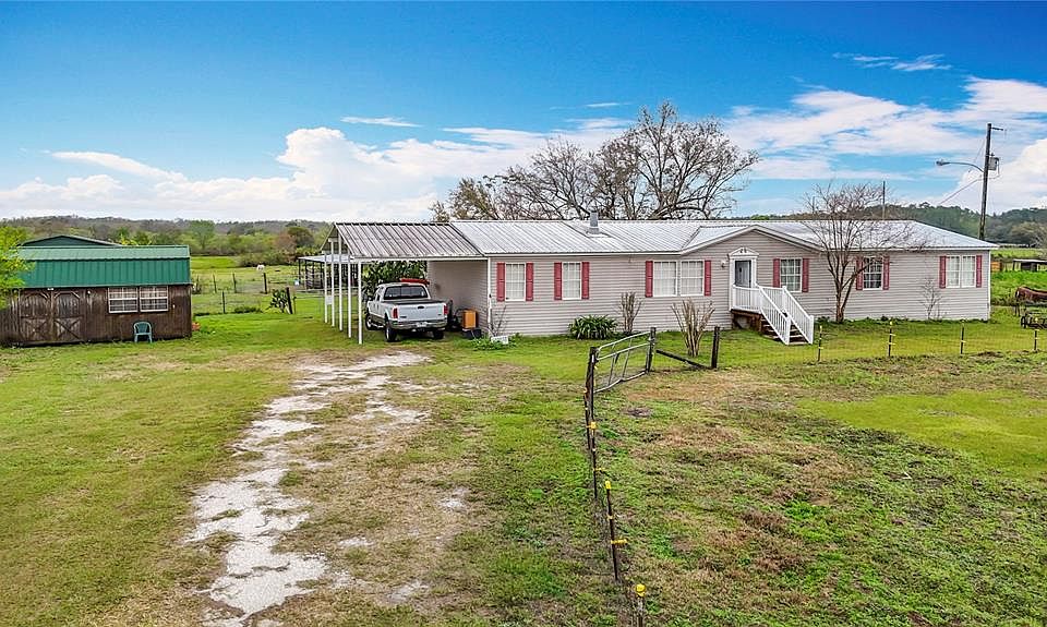 PRICE REDUCTION! Under Pre-listing appraisal! Spacious 2004 Fleetwood Model on 5 Acres – Perfect for Country Living! No Deed Restrictions! No HOA! Discover peaceful country living with this open 2,310 sq. ft. 2004 mobile home on 5± acres. Offering 4 bedrooms, 2 baths, and a split-bedroom floor plan, this home is designed for comfort and versatility. Bring your horses, farm animals, and enjoy country freedom! Large great room with open living space with built-in shelving, a wood-burning fireplace, and a front door with a glass storm door. Carpet has been taken up in great room, hallway and one of the bedrooms. There was a leak with the washer which caused floor damage in laundry room, bathroom and bar area of the den. Spacious kitchen with oak cabinetry, walk-in pantry, movable island, and appliances including refrigerator, dishwasher, and oven. Dining area is adjacent to the kitchen, featuring a built-in China cabinet/buffet with glass-front cabinets, and double sliding glass doors going onto a back porch that does need some repair and overlooking the serene pasture. Expansive den with double-door entry, wet bar, built-in cabinetry, and a spacious hallway with built-in linen cabinets and desk. Inside laundry area with washer/dryer, upright freezer, built-in cabinetry, and convenient exterior access. In Primary bedroom, double sets of mirrored closet doors, ensuite bathroom with double sinks, glass-enclosed shower, large garden tub, and walk-in closet. Volume ceilings and ceiling fans in the great room, den, and master suite. Large metal workshop, pole barn, and 3 smaller storage sheds. New Metal Roof in 2018 and New AC in 2024! Conveniently located with easy access to Lakeland, 7 miles to Zephyrhills. This home offers endless possibilities for country living. Don't miss this unique property!