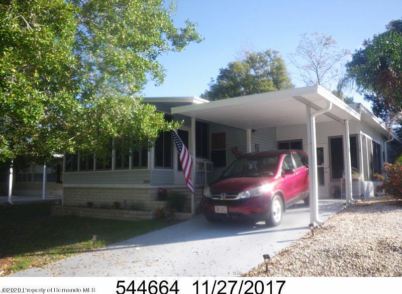 Smaller floor plan extended by three separate enclosed lanai's. Wood deck and brick patio in rear with arbor overhead. Backyard fenced with chain-link. Spacious utility shed with laundry tub and lots of loft/storage. Convection oven in kitchen, laminate through out. Remolded showers in both bathrooms! 55 plus retirement golf community with security near restaurants, entertainment, and the Suncoast Parkway.