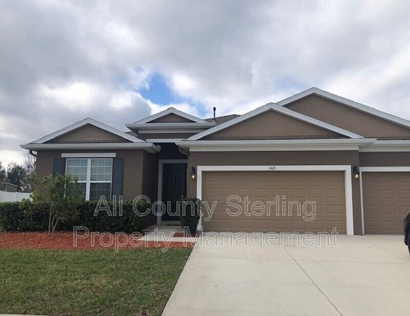 From the moment you pull into the driveway of this well manicured home with a 3 car garage you'll feel spoiled. The lawn is meticulously landscaped & is included in rent. The interior is just as spotless & beautiful featuring a soft neutral color pallet. The upgraded custom light fixtures start at the foyer entry and continue in the great room dining area as well as the eat-in kitchen. The beautiful kitchen, overlooking the great room, features granite counters, a gas stove, a huge island for seating and food prep, loads of 42" cabinets plus a step-in pantry and stainless appliances. Large glass sliders in the great room invite you to the covered patio overlooking the manicured private back yard. New wood vinyl flooring through-out the huge great room and bedrooms and tile flooring in all the wet areas. The floor plan is a split plan with the 4th bedroom & patio bath separated on the opposite side of the home, perfect for an in-law or guest suite or an office. The master bedroom features a tray ceiling, his & her closets with one being a walk-in. The master bath is grand with separated dual vanities, upgraded lighting, large soaking tub, separate walk-in shower & separate water closet. Both of the other bathrooms feature a shower/tub combo, granite vanities & upgraded lighting as well. The large laundry room greets you from the garage and includes newer energy efficient washer/dryer and shelving. Additional features include farmhouse style paneled doors, faux wood blinds, upgraded baseboards & smoke alarms through-out the home. Sm dog okay, NO CATS. HOA requires separate background screening, $50/adult.