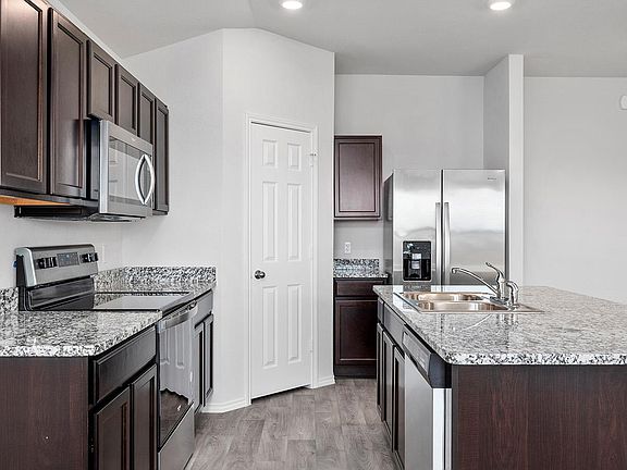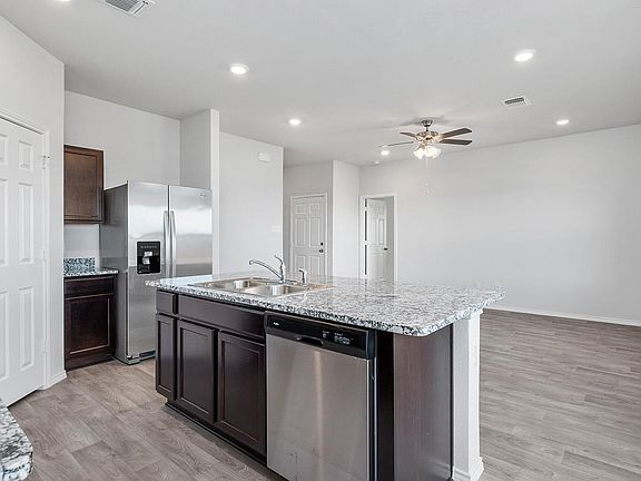 The Ashburn floorplan at Oak Ridge in Temple, Texas is a 3-bedroom, 2-bathroom single-story home covering approximately 1,263 sq. ft. The 2-car garage ensures plenty of space for vehicles and storage. In this floorplan, you’ll find a home that makes the most of its space. The kitchen features beautiful shaker-style cabinetry with granite countertops as it flows into the dining area and great room. The bedrooms are carpeted, and the primary bedroom has an attached bathroom with a walk-in closet. The secondary bedrooms are cozy and carpeted, with plenty of closet space. The laundry room and a secondary bathroom are perfectly place next to these rooms for easy access. Enjoy nature from the backyard covered patio that is attached to the dining area. Here you can start or end your day relaxing with nature. Like with all our homes, you’ll never be too far from home with our smart home technology thoughtfully designed into every detail. Find security and control through the Qolsys panel, your phone, or voice and when you want to add additional smart home tech, easily integrate with Z-wave or Bluetooth technology. Come visit the Ashburn floorplan today to find your new home!