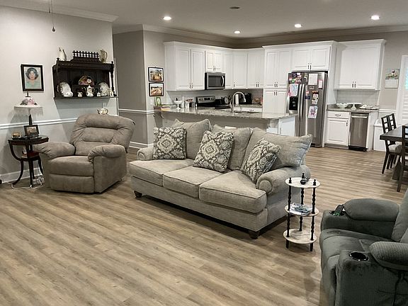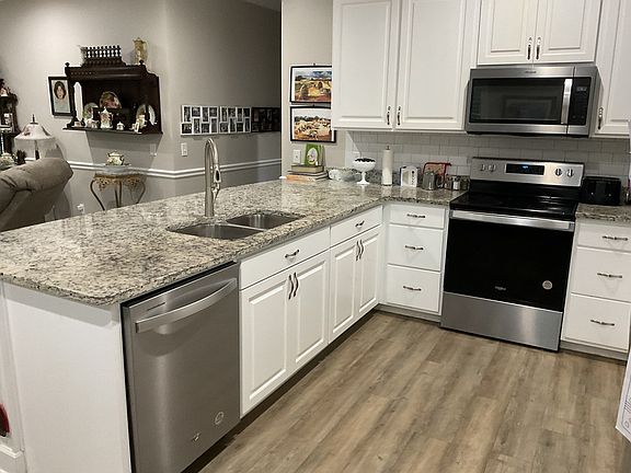 The house is level with the ground, NO STEPS. It has county water, and it has a deep well. Property includes a 10 x 12 storage building, and has 450' of paved road frontage. The second bath has a handicap tub and granite county tops. Kitchen has S/S appliances including a trash compactor. Familyl room has an electric fireplace. The house has PLANTATION SHUTTERS THROUGHOUT.