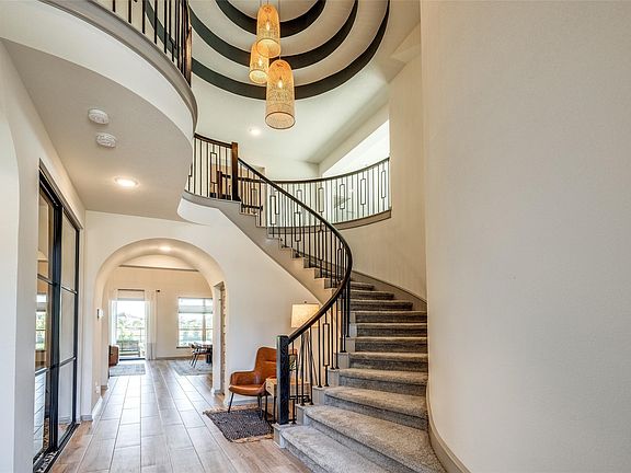 A Stunning Premium Lakefront Retreat! Experience elevated living in this beautifully designed home featuring cathedral ceilings with exposed trusses, creating a dramatic and open atmosphere. The open-concept living and kitchen area is perfect for entertaining, with custom built-ins, a wet bar, and a stackable patio door that blends indoor and outdoor living. Enjoy serene lake views from a covered patio, with no back neighbors. Oversized game room offers flexible space for recreation or relaxation, the upgraded office/study provides a quiet and stylish workspace. Primary suite is located on the first floor, along with a second bedroom, ideal for guests or multi-generational living. Primary bathroom has a soaker tub with separate vanities and a walk-in closet that connects to the mud/ laundry room. Every bathroom has updated lighting and mirrors, and chandeliers add a touch of luxury throughout the home. Don’t miss this opportunity to own a lake lot with upgrades and timeless design.