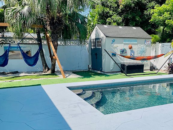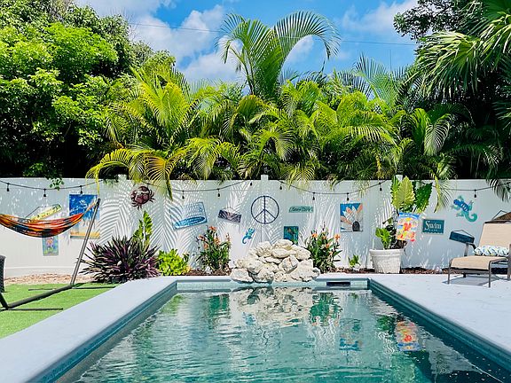 Escape to your Key West oasis! Just a 15-min walk to Duval and 5-min to the beach, this home sits on a safe, quiet street. Enjoy a fully fenced yard, dog-friendly space, and a gorgeous heated/chilled pool. The outdoor oasis features hammocks, swings, ping pong, grill, and a covered patio with movie area. Inside is spotless and comfy with 1 queen bed in the master bedroom, a full size bed and set of twin bunk beds in the 2nd bedroom, and a pull-out sofa in the living room.