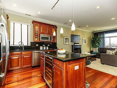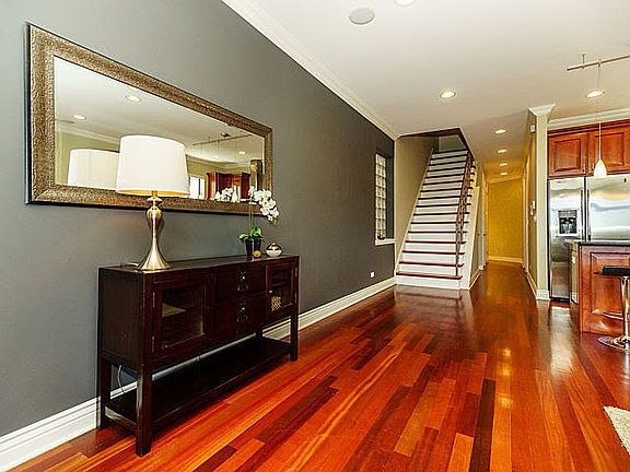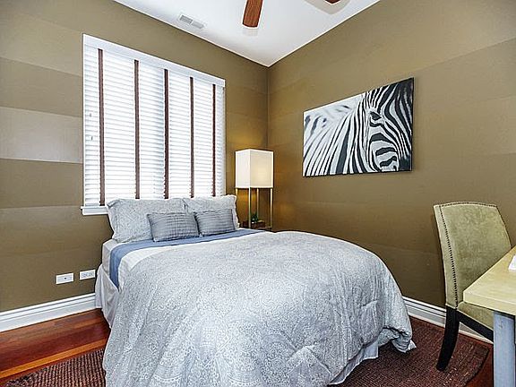 Penthouse with a private roof deck! Wide floor plan 2BD / 2BA Wicker Park location. Conveniently located from 606 Trail, Blue Line CTA "L" station, and Wicker Park & Bucktown restaurants and night life. Contemporary home is nicely upgraded with crown mouldings, sculpted tall baseboards, and trim work. Brazilian Cherry hardwood floors throughout. Gourmet kitchen has stainless SS hood, island, raised panel/glass door cabinets and crown mouldings and in/under lighting, Absolute Black granite counter tops and full back splash and upgraded SS GE appliances, and wine refrigerator. Brizo luxury faucets and showerheads throughout, nest thermostat, new high-efficiency furnace, and water-heater. Elfa custom closets. Large master bedroom fits a king bed, 2 night stands and more! Master bathroom includes walk-in shower, jetted tub, wide, comfort height vanity, and granite floor and surround tiles. Second bathroom full marble and granite tiles, free standing vanity, and walk-in shower. In-unit washer/dryer. Abundant closet space, recessed lights, ceiling fans, and more! One secure parking space included. One secured ground floor storage closet. Great neighbors! Views of Chicago skyline from the roof.