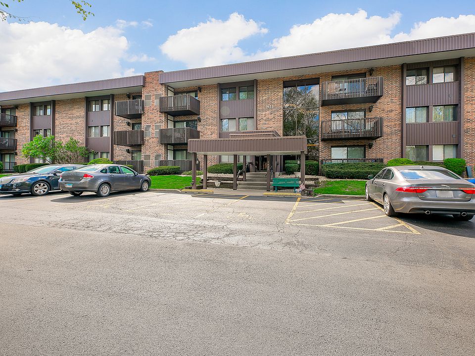 Don't miss out on this 3 bedroom, 2 full bathroom corner unit in Woodlawn Terrace. This second floor spacious condo is in a secure elevator building with 2 balconies that offer panoramic views of the courtyard. The eat-in kitchen offers great cabinet space and is adjacent to the dining room. The large living room area has a brick wood burning fireplace and balcony. The master bedroom has lots of closet space, a private bath and a 2nd balcony. Two additional bedrooms and full bathroom. Laundry closet with full size washer and dryer. Underground heated parking garage with 2 parking spaces and additional storage. Furnace (2008) & hot water heater (2022). Complex amenities include indoor pool, exercise room, clubhouse and large courtyard. This condo is conveniently located to I80 expressway entrance, schools, shopping and restaurants.