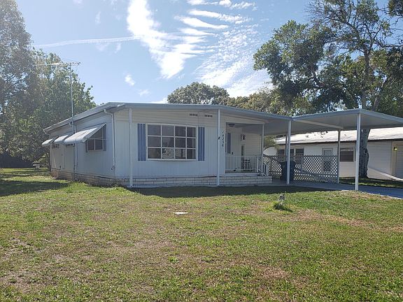 Up front location in community if your looking for a short drive home. Original windows have been replaced. Enclosed porch for year around lounging. Over-sized utility shed with a laundry tub. Some laminate flooring. 2 closets in the master bedroom. Needs some TLC. 55+ retirement golf community, close to restaurants, entertainment, and the Suncoast Parkway.