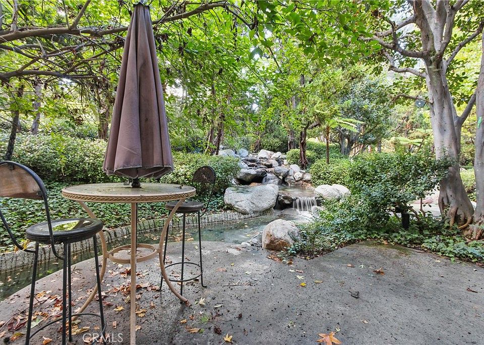 Welcome to this Mediterranean style home with your very own lush oasis. As soon as you enter the front door your eyes are immediately drawn to the back patio where you are surrounded by lush greenery, a babbling stream and the sound of a waterfall. Your spacious and private patio allows for plenty of space to sit and dine, for a BBQ grill, to entertain or just sit & relax while enjoying your surroundings. Back inside you are welcomed by the home’s slate floor and stone accents throughout. The custom stone arch in the living room is repeated on the inviting fireplace. Imagine yourself cozied up to this fireplace while you hear the waterfall just outside your back sliding glass door. The kitchen has plenty of counter and cabinet space complete with a pantry and bar seating. Both bedrooms offer you wall-to-wall closets and hardwood floors. Brand new blinds in the front bedroom allow you to control how much natural light you let flood in. Both bathrooms are accented with slate tile floors and tub and shower combos. The primary suite at the end of a private hallway offers more storage closets and a tall vanity area with double sinks. The walls are treated with a Venetian, plaster-like finish on the walls and some ceilings.  At the end of the hall the spacious primary bedroom, with its hardwood floors and stone accents again is bathed in the views of lush green plants and trees outside. No more perfect place to unwind after a long day while listening to your very own babbling brook and waterfall just outside. Don't forget the ease of having your own private washer/dryer closet in the unit. This glorious home is situated within the Harbor Gate gated community that offers such amenities as a spa & pool and Elevator access from its subterranean side-by-side parking and received a multi million dollar update in 2015 including a new roof, siding, new landscape and refurbished stream. Don’t miss your opportunity to call this your new home.