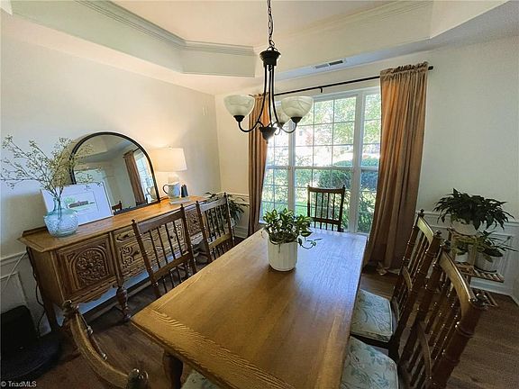 MEADOW CREEK 4 Bed 2.5 Bath! Enjoy the beautiful kitchen with white cabinetry, tile backsplash, Stainless-steel appliances, and Quartz counter tops adjoined to a large peninsula island. The lovely primary is on the main level for easy access and is paired with an updated en-suite. The En-suite also has a walk-in shower and spacious closet. Throughout the house the floors have LVP Flooring, except for tile in the bathrooms and laundry area. The living room is decorated with a beautiful gas log fireplace with a blower. The back private patio is covered by an electric awning and has a freestanding fire pit. The yard has easy access to a community trail. The house also has lots of privacy without the presence of neighbors on the right side and behind the house. This property shows great and can be yours today!