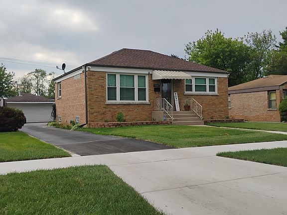 Charming two-bedroom brick ranch. kitchen appliances, eating area with white cabinets, ceramic tiles, granite countertops and backsplash. Also updated bathroom with ceramic tile. Hardwood floors in living room and bedrooms. Basement is ALMOST finished, laundry room with new washer and dryer, Sump pump is 3 years old. house has new gutters new windows. Two car detached garage with new door and siding WITH DRIVEWAY TO A NEW SIDEWALK. Complete new PVC running drainage to sewer from the house to the street. Enjoy this house with a pleasant backyard privately fence with a patio and a gazebo and a peach tree to enjoy. This house is close to schools Metra train and stores