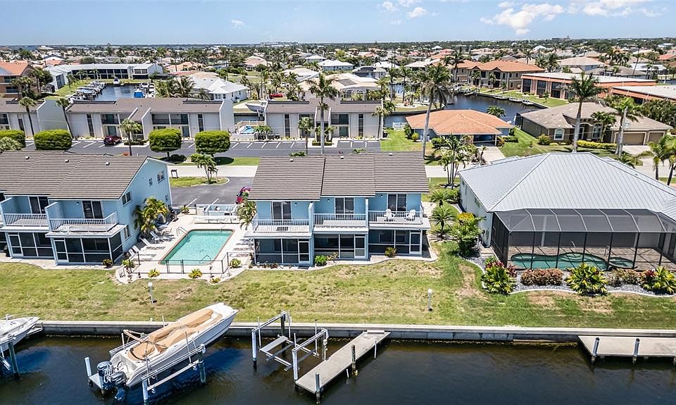 Offers 1% lender credit at closing. BRING YOUR BOAT! This fully furnished waterfront condo in Punta Gorda Isles features 2 bedrooms and 2.5 bathrooms, along with a deeded dock that offers quick boating access to Charlotte Harbor and beyond. The spacious, open main floor includes a great room, dining area, and an updated kitchen, which showcases custom marble-look epoxy countertops and a subway tile backsplash. The great room opens to a tiled, screened lanai that overlooks the canal and docks. A large laundry room with a full-sized washer and dryer also serves as the first-floor half bath, while a sizable storage closet is conveniently located under the stairs. Upstairs, you will find two master suites, each with new wood-look vinyl flooring and private baths. One of the suites includes a private balcony that offers a view of the canal below. The lanai has direct access to your private dock, which is equipped with a 5,500 lb boat lift—perfect for keeping your boat right at your back door. Water and electric hook-ups are available on the dockside. Set sail from your backyard and enjoy some of the best fishing and boating in Southwest Florida. .Condo amenities feature guest parking and an in-ground heated pool. This property is ideal for someone looking to downsize, use as a winter or weekend retreat, or consider as an investment opportunity with rental income potential.