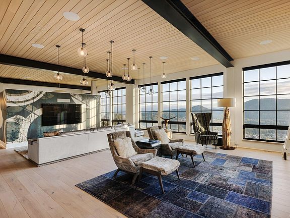 Wine fridgeCovered bbq stationOpen-concept living spaceStriking entertainment wallDramatic window wallPrivate officeTriple garage with skylights