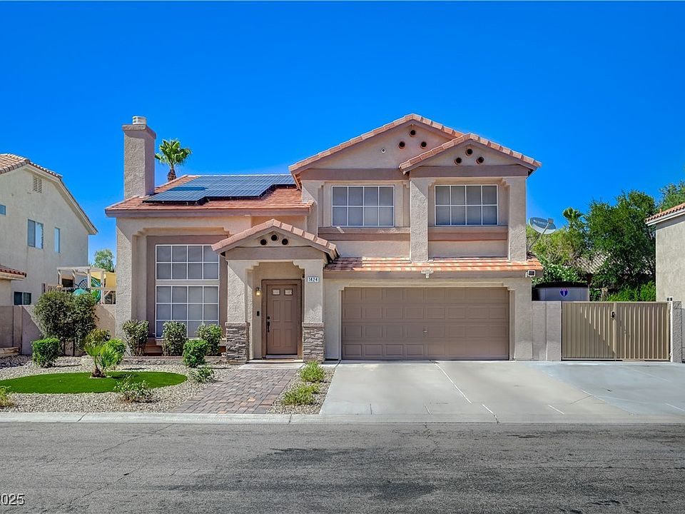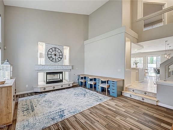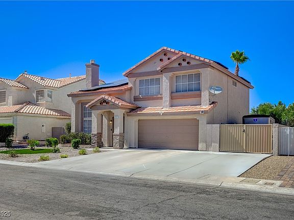 Stunning remodeled home with huge rear yard and oversized swimming pool and spa. Pool has color changing and strobe lights for amazing effects! Custom built playground equipment can stay. Gated RV parking with pavers on east side for less sun and 3-car front driveway. Beautiful kitchen with quartz countertops, extend cabinets, upgraded appliances and upgraded backsplash. Warm and cozy 3-way fireplace in front living room area. Separate family room with awesome built-in TV projector and retractable drop down screen. Bathrooms are remodeled and very modern! Dual head shower at primary bath shower. Quartz countertops at upstairs bathrooms. Tankless water heater. New paint. Synthetic grass in rear yard and recently upgraded landscaping. This property is centrally located and close to everything!! Perfect home to relax with your family and enjoy everything Vegas has to offer.