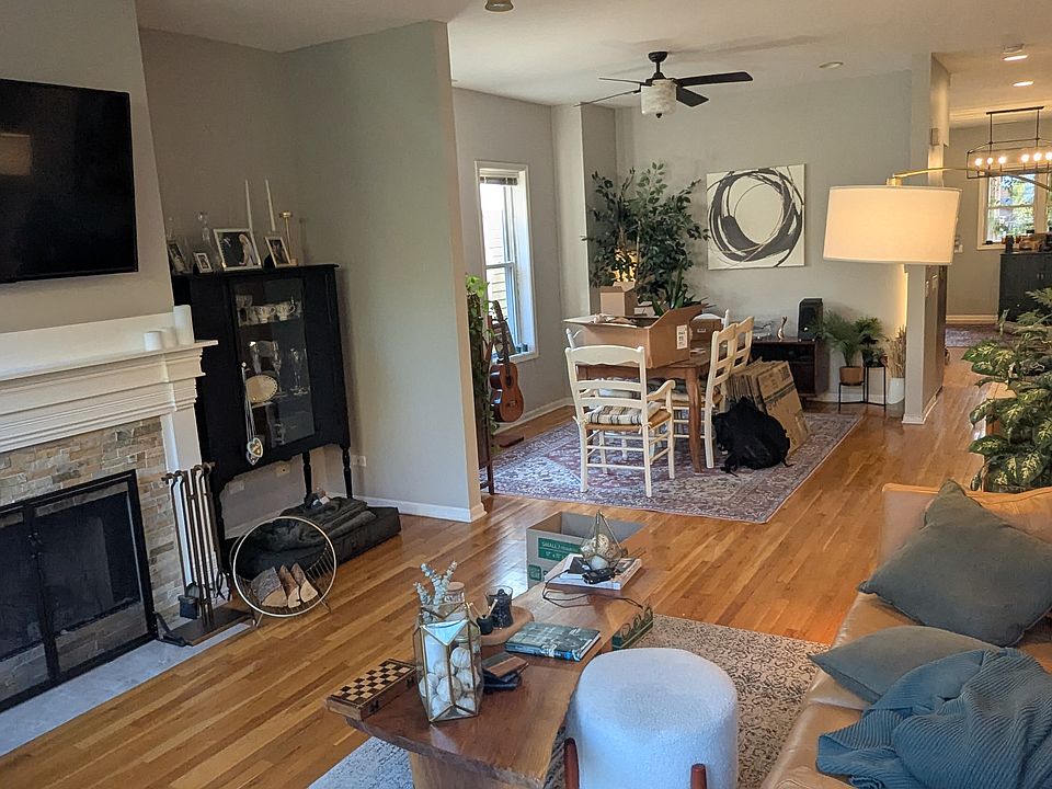 Stone gas fireplaceFront outdoor porchTwo back deck spacesIn unit washer dryerHardwood floors
