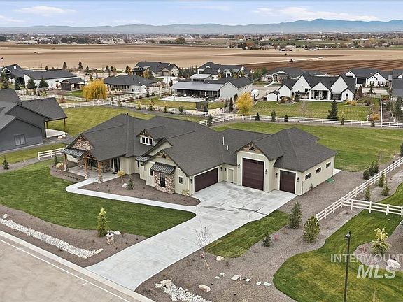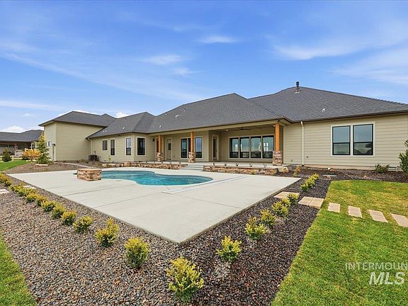 Set on 1.07 acres, this custom Larry Richardson Construction design showcases a year-round pool, mountain backdrop, and finished 34' pull-through boat bay plus 46' RV bay. The moment you step through the glass-framed entry, the home opens in a wide reveal of wood floors, layered ceilings, & clear sightlines to the coffered great room. Natural light carries you toward the stone fireplace flanked by custom built-ins, while the kitchen’s sage cabinetry, brick tile, and oversized island form a seamless extension of the space. A fully outfitted walk-in butler’s pantry, under-cabinet lighting, statement pendants, wood-accented range hood, plus built-in stainless steel appliances w/ double ovens, gas cooktop, refrigerator & beverage cooler. The dining room adds a built-in hutch w/ display shelving & nearly floor-to-ceiling windows that frame backyard views. Full-suite bedrooms and dedicated office round out the interior design, while an additional half bath connects to the patio for seamless pool access. The primary suite adds full-height slat accent wall, walk-through shower, free-standing tub, split vanities, and wraparound closet with integrated dresser cabinetry. An extensive covered patio steps down to the heated pool surrounded by meticulous landscaping and open sky views. Lake Lowell & Sunnyslope Wine Country sit minutes away, with quick access to Costco, shopping, dining, and I-84.