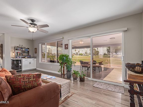 You don't want to miss this 3 bedroom home in Phase II of Sun City! This beautiful residence is a perfect balance of style & comfort, welcoming curb appeal, manicured landscape & a 2 car garage with epoxy flooring. Interior features an open floor plan with ceramic wood plank tile throughout, huge windows for plenty of natural light and great views. The modern kitchen displays recessed lights, custom shaker cabinetry for abundant storage, tile backsplash, granite countertops, breakfast bar & SS appliances. Cozy master suite has two walk-in closets and a bathroom with double sinks for convenience. Den is perfect for an office or craft room. Pluses: Sewer & water lines are up-to-date; Solar is owned outright. Pull out shelving through-out. Bar with built in wine cooler