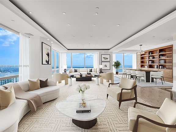 Four Seasons Residences Brickell Unit 54DEF offers 8185sf of refined living at Miami’s most prestigious address. Three residences have been seamlessly combined into one breathtaking residence in the sky with soaring ceilings, Italian hand-laid mosaic floors, floor-to-ceiling windows framing unobstructed views of Biscayne Bay, the ocean and the Miami skyline. Two private elevators open to a beautiful foyer, expansive living/dining areas, chef's kitchen, 2nd eat-in kitchen and staff quarters. A grand primary suite w/his & her bathrooms, the two private guest suites, wine cellar, theatre and office/library. Exceptional Four Seasons service defined by elegance, privacy, and exclusivity with world-class amenities including Equinox gym, resort pools, fine dining, plus 5 assigned parking spaces.