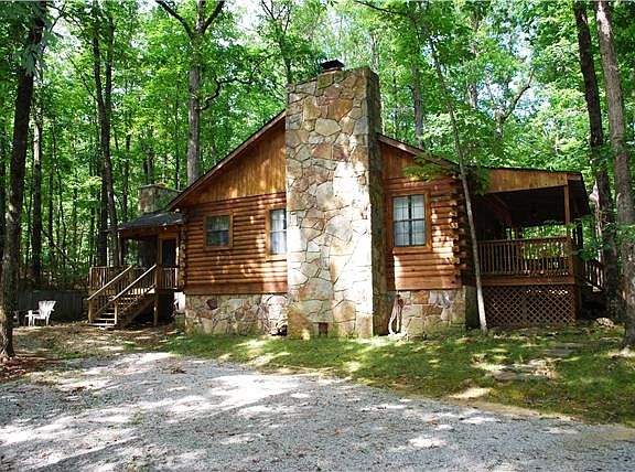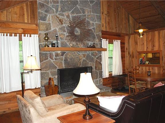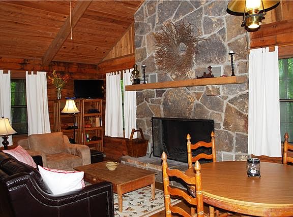 CLIFFTOPS cozy log cabin in the woods w- two mountain stone wood-burning fireplaces--one in the living area, and other on a 19x21 screened porch. Two bedrooms & large sleeping-loft. Updated kitchen has stainless appliances & silestone countertops.