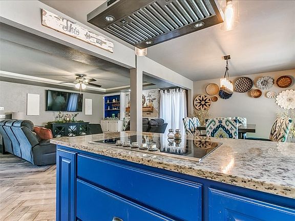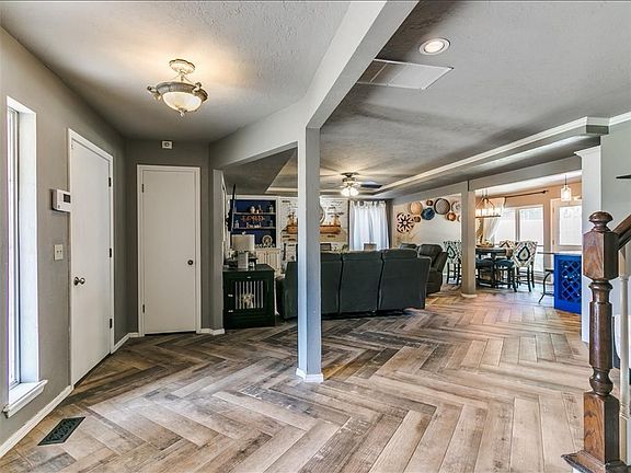 Recent open kitchen remodel with granite counter and free standing island with stove top. Stainless appliances, herring bone pattern tile floors, french door, big windows and white cabinets. 3 beds down and 1 bed , full living , full bath and flex space with storage on second level. Second level is perfect for teenagers or if you have additional family members as guests or living with you! Second level living space has extra long wet bar, counter sink, and small fridge. 3 beds down including primary. Primary bath has separate tub, shower and walk in closet. Flagstone patio with extended porch and concrete area for backyard entertaining. Living is open to dining and kitchen with brick working fireplace. 3 car extended driveway with updated garage door and opener. This house has so many extra living possibilities, flex spaces or extra office space. South Edmond location makes it great for commute right off Kelly. Great appeal inside and out! Community pool in walking distance in a the Great Copperfield neighborhood!