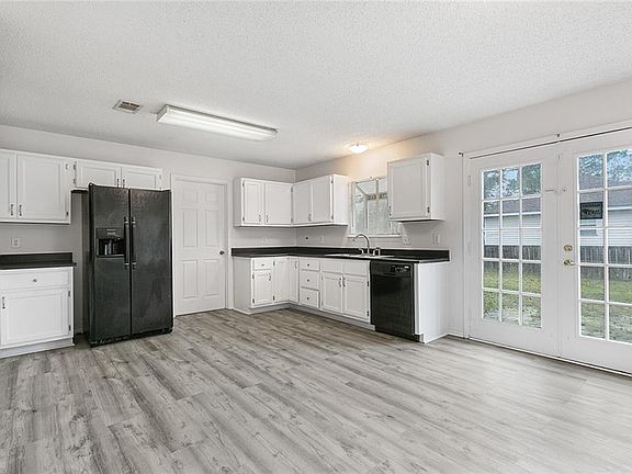 The modern kitchen boasts white cabinets and black countertops, and there's a large laundry area for added convenience. The home also includes generously sized bedrooms and bathrooms, ensuring comfort throughout.