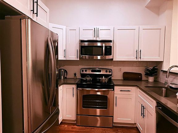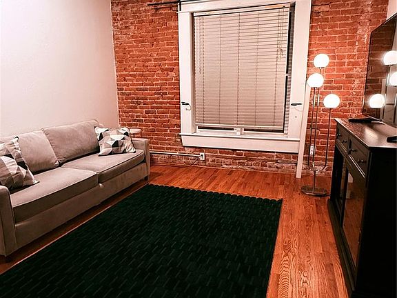 Step inside to find stunning exposed brick walls, rich hardwood floors, and soaring 11-foot ceilings that add a sense of grandeur and openness. The updated kitchen is a chef's delight, featuring sleek stainless steel appliances, ensuring every culinary adventure is a pleasure. An innovative sliding barn door artfully separates the cozy living room from the bedroom, providing both character and functionality.