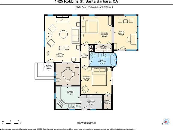 The bathroom is a standout with vaulted ceilings, abundant natural light from a skylight, a clawfoot tub with shower, and striking black-and-white ceramic tile floors. The second bedroom includes a walk-in closet and sliding door to the rear patio, while the primary bedroom opens to a versatile sunroom/office with patio access. A hallway linen cabinet preserves original charm. Additional highlights include dual-pane windows, forced-air gas heating, and a garage with studio area and full bath. The backyard features an outdoor fireplace, brick patio, and mature avocado, lemon, and orange trees. Conveniently located near schools and parks.