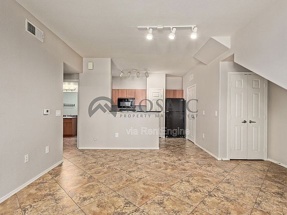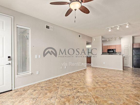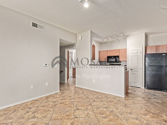 Discover refined living. This rental retreat features a seamless blend of modern comforts and thoughtful design across its generous layout. Vaulted ceilings and abundant natural light create an open, airy ambiance. The kitchen has plenty of counter space with faux granite countertops and plenty of cabinet space. The refrigerator is perfectly place to add additional pace for the chef of house.