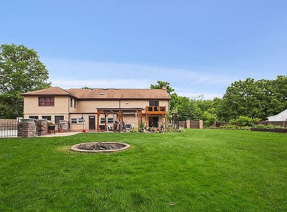 This exquisite custom home is definitely ONE-OF-A-KIND. Just shy of 1/2 an acre lot, enjoy the custom Pergola, with nearby fire pit, beautiful stone lighted pillars and built in grill. Deck in back is maintenance free vinyl. Programmable front lawn sprinkler system, 35 year Architectural shingles, custom cedar 2nd floor deck, gorgeous backyard landscaping, INSIDE- Second floor elegant bamboo flooring throughout. Main level, cherry and maple hardwood through the majority of rooms. Sleek stainless steel appliances in kitchen, gorgeous quartz countertop, new flooring and LED lights. Huge master bedroom with gas fireplace, ensuite with 2 person shower, double vanities, whirlpool tub. Architectural railing upstairs in gallery. Attached 3 season room. Separate HVAC and zoned control. So many windows in this outstanding home. WHOLE HOUSE fan. You MUST come see this home right away. It truly has so much to offer!