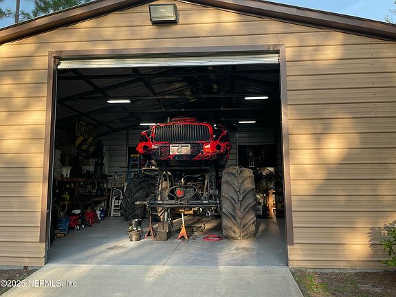 Detached workshopStaggered cabinetsCommercial garage doorMulti-purpose nookGlamorous bathDesigner tileExpansive porch
