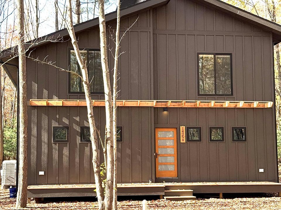New Construction! This remarkable contemporary in Harbert exemplifies upscale living amid scenic natural surroundings. Designed with an emphasis on eco-friendly and sustainable architecture, the home provides comfort and efficiency. The open-concept floor plan unites indoor and outdoor living spaces, making it an ideal retreat. The kitchen, outfitted with stainless steel appliances and stone finishes, is tailored for entertaining. A vaulted ceiling and inviting fireplace provide a main living area with warmth and character. Relax on the spacious deck or unwind in the screened porch, while taking in the peaceful views of the wooded landscape. The property is conveniently located just a short drive from the sandy beaches of Lake Michigan. Residents enjoy association amenities including walking trails and a stocked pond. Short-term rentals are not allowed, providing a tranquil and private community.