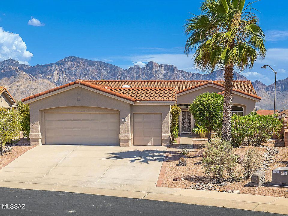 Newer Sun City Oro Valley Mayfair model with Golf cart garage, Den, extended patio, ramped entry pool and sunken Hot Tub. Close to Honeybee Canyon with amazing unobstructed views of Pusch Ridge and the Catalina Mountains. Prime Cul de Sac location near all the Sun City Amenities. Freshly painted and ready to go. Very private! Buyer to pay one time Capital Improvement fee of $3202.50 at closing. No one under 19 permitted to live in neighborhood.