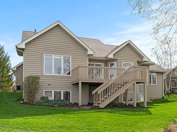 Welcome to luxurious living in this meticulously maintained 2424 sq. ft. villa on a peaceful cul-de-sac street. The 3 bedroom split floor plan design also offers a den, foyer and living room. Gather around the multi-sided gas fireplace or entertain guests in the dining area and stylish kitchen with granite countertops. Step out to the deck and enjoy alfresco dining. The master suite is a true retreat, boasting a spacious walk-in closet, jet tub, and separate shower. The lower level is a haven for entertainment offering a daylight basement with 9' ceilings. Here, you'll find a bar, kitchen area, study, and a workout room that can easily convert to an additional bedroom next to the full bath. The basement offers great storage areas. For the hobbyist there is a 10x15 work shop in the garage. Recent updates include a new roof in 2022 and a new furnace in 2023, new flooring in master suite, plus, the entire home has been freshly painted. Nature enthusiasts will love the walking trail adjoining the backyard, offering an escape into the serene outdoors. Don't miss out on the opportunity to make this one-owner home yours! Schedule your viewing today.