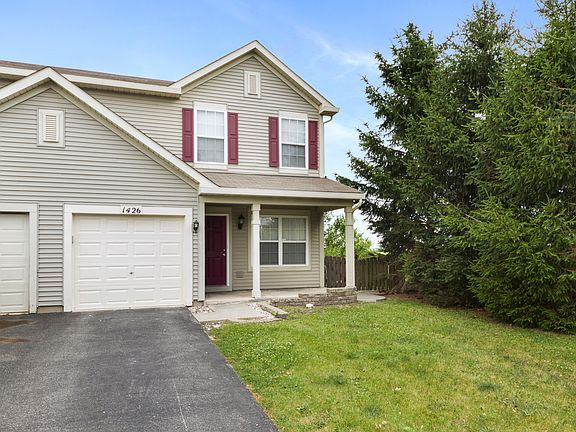Welcome to 1426 Dahlgren, a charming 1,426 sq. ft. duplex located in the Lakewood Trails community, known for its pool, clubhouse, and tranquil setting. This delightful home offers a blend of modern amenities and cozy living spaces. Upon entering, you're greeted by a spacious family room and living room, perfect for entertaining or relaxing. The kitchen is a chef's dream, featuring cherry cabinets and sleek black appliances, with a convenient powder room nearby. A sliding glass door off the kitchen opens to your private, fenced backyard, complete with a firepit - ideal for gatherings or unwinding in your own oasis. Upstairs, the master bedroom is a true retreat with vaulted ceilings and a large walk-in closet. An additional large bedroom provides ample space for family or guests, and the versatile loft area can be tailored to suit your needs, whether it's a home office, playroom, or cozy reading nook. Situated at the end of a peaceful street with open land next to it, this home offers added privacy and expansive views. With easy access to I-80, you'll enjoy a quick commute and a variety of dining, shopping, and recreational options in nearby Minooka and Channahon. This home is not just a place to live, but a lifestyle to embrace. Don't miss the opportunity to make 1426 Dahlgren your new address.