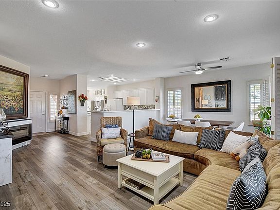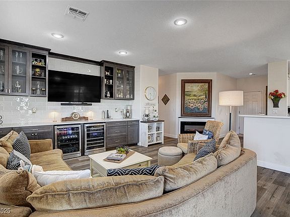 Beautiful townhome in the desirable Sun City Anthem community! Prime location at the end of the street, offering stunning mountain views. This move-in ready home features New Luxury Vinyl Flooring, fresh baseboards, skylights, abundant windows, and plantation shutters throughout. Impeccably maintained and tastefully designed, it showcases classic white cabinetry, & new ceiling fans that bring style and comfort to the rooms. A Nest thermostat adds convenience and energy efficiency along with an installed EV outlet in the garage. Custom touches include a built-in entertainment area in the living room with a wine cooler and beverage cooler. Since this townhome is at the end of the Villas, enjoy the extra side lawn and space! Sun City Anthem, a premier 55+ community, offers world-class amenities: two golf courses, indoor/outdoor pools, a fitness center, walking track, craft/hobby studios, card/billiards rooms, computer lab, grand ballroom, tennis/bocce courts, and so much more!