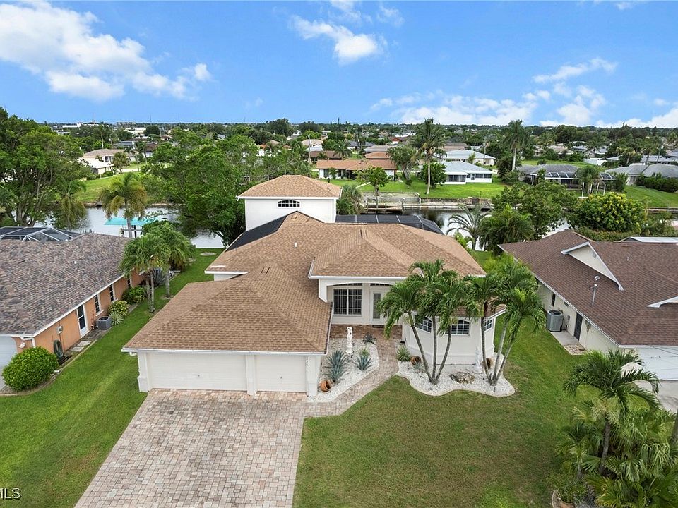 Gulf Access Pool Home with Fast Boating Access and Southern Exposure! Located on an extra-wide 120+ foot canal offering quick boating access and a wrap-around dock with boat lift and Tiki Hut—perfect for boaters and waterfront living enthusiasts. This home truly checks all the boxes, featuring 3 bedrooms + a den, 3 full bathrooms, a deep 3-car garage, and sought-after SOUTHERN EXPORUSE for most daytime sunshine on your pool and patio. Built in 2004 with quality and elegance in mind, this home features 12-foot ceilings, 13-foot tray ceilings, 8-foot doors, and a bright, open-concept layout designed for comfortable living and entertaining. Enjoy water views from nearly every room in the house and a seamless indoor-outdoor lifestyle. The kitchen is both stylish and functional, offering bar-top seating, abundant cabinetry, and plenty of counter space for cooking and gathering. The first-floor primary suite overlooks the pool and canal, featuring dual walk-in closets, dual vanities, a soaking tub, and a stunning walk-through shower. Upstairs, a private second master suite provides an elevated view of the water and pool—perfect for guests or multigenerational living. All guest bedrooms are spacious and located near full bathrooms, making this an ideal layout for families, seasonal guests, or vacation rentals. Step outside to your resort-style pool and hot tub, perfect for relaxing weekends or unwinding after a day on the water. The 2023 roof, paver driveway, and elevated finishes throughout. This prime location places you just minutes from Starbucks, Target, Publix, top-rated dining, and shopping, as well as Cape Coral’s most exciting upcoming developments like Bimini Square, The Cove, Slipaway, and the new Yacht Club Beach project. Whether you're entertaining guests, hosting family, or simply enjoying the peaceful beauty of your waterfront retreat, this home offers a rare combination of size, quality, boating access, and value.