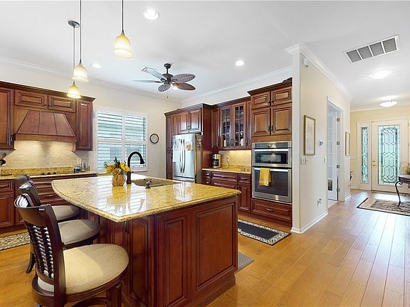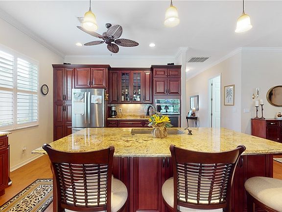Discover resort style living in a bundled golf community, where there are no cart fees with this golf home. Feel the comfort and serenity of this remodeled home complete with pool for relaxing and entertaining. This home has a brand new roof (July 2023) and numerous upgrades, such as a beautiful open kitchen remodel, enhanced by a large granite island facing the open area to the pool and great room. There is also a new 3.5 ton air conditioner, new air handler and new whole house air filter duct being installed!!! This design offers plenty of storage drawers below the island and don't miss the exhaust fan re-mounted to an outside kitchen wall. The maple engineered hardwood flooring compliments the beauty of this kitchen. complete with stainless steel appliances. There is a hurricane safe, high impact all electric operational shade encompassing the length of the lanai and the pool area has been recently re-screened and painted. Aside from the many upgrades, there are plantation shutters, crown molding, and remodeled guest and master baths and a den. The beauty of this Brighton floorplan will capture your attention to the wide open feel of this most sought after model. Golf cart included with the sale of the property!!!! As far as value this home speaks for itself!!
