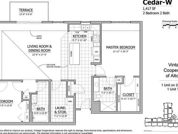Vintage Cooperative of Altoona offers a maintenance-free alternative to home ownership that is uniquely different from other 55+ housing options. Featuring the finest in quality construction, our thoughtfully designed floor plans range from 1050 - 1641 sf. Our community also includes a variety of common areas keeping the needs of our active co-op members in mind. FLOOR PLAN - CEDAR W: This 1,417 sq.ft. Cedar floor plan includes 2 bedrooms, 2 bathrooms, and a covered patio. Our community also includes a variety of common areas such as a library & coffee area, lounge with fireplace, great room with serving kitchen, fireplace, and outdoor patio, guest suite, fitness center, workshop, club room, multi-purpose room, and raised garden plots!