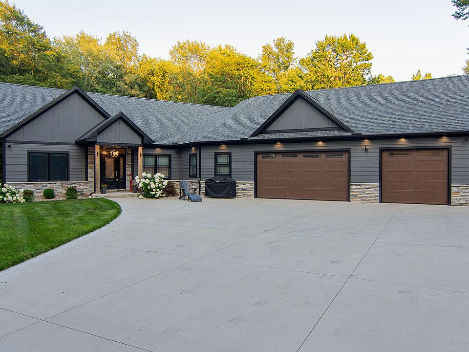 This stunning ranch home built in 2020 is nestled on a 1.5-acre lot in Howard Twp. The main floor has beautiful bamboo hardwood floors & an open concept layout of the living room with gas fireplace, dining room & kitchen. The kitchen features quartz countertops, a pot filler near the 6 burner Wolf stove & walk in pantry. All kitchen appliances are still under warranty. The primary bedroom has ample space & great view of the screened porch- a perfect spot to enjoy your morning coffee. Primary bath has a gorgeous shower with dual shower head system & walk in closet. Main floor also hosts a second bedroom & full bath, an office & main floor laundry. Basement has two more bedrooms with egress windows & a full bath. There's also additional finished living space, perfect for entertaining!