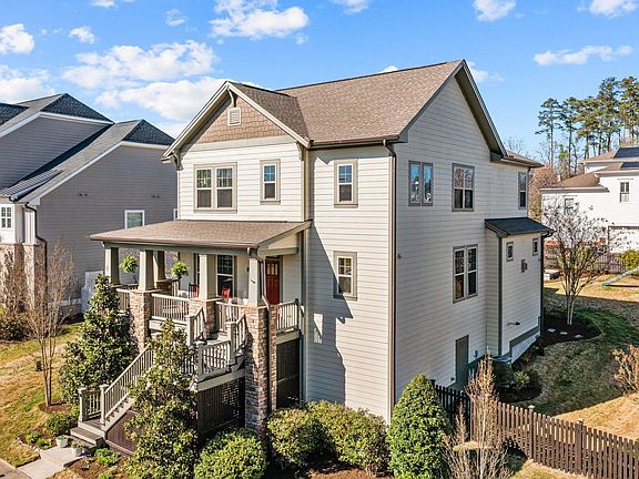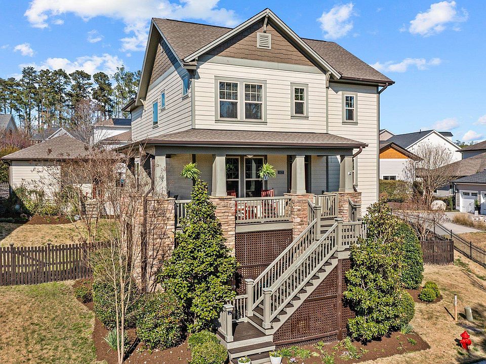 Gorgeous, custom craftsman home in the heart of highly sought after Briar Chapel, close to the pools, clubhouse and playgrounds. Don't miss the chance to own this home on a premium, larger lot! Here you will enjoy the private, wooded views from the front of the wrap-around porch, or relax by the beautiful, custom stone fireplace in the backyard. A detached garage leads by breezeway to the cozy screened-in porch. Inside you will find a modern yet timeless design in an excellently maintained home. Stunning features around every corner, many upgrades including hardwoods throughout, updated light fixtures, and built-ins. The centerpiece of the main floor is the huge granite island in a chef's dream kitchen that flows into the dining & spacious living rooms, perfect for cooking and entertaining. The study overlooks private woods, a dream view! Upstairs, relax in the loft, or retreat to one of the 3 bedrooms, including a sanctuary of a master bedroom with its spa-like en-suite. Large yard features 3 native pollinator gardens with over 40 species of native plants, custom cedar garden beds, & privacy fence.