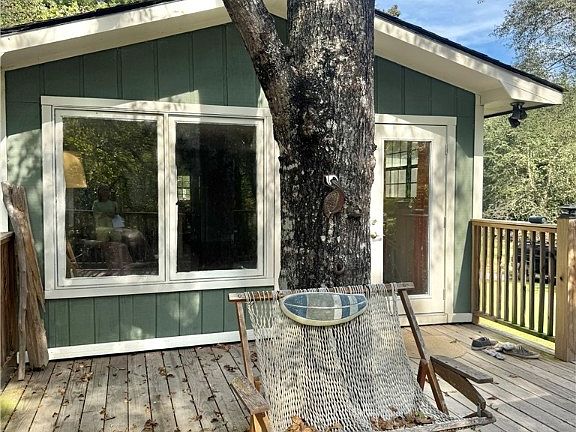 The main cabin is a peaceful, rustic retreat, with a new deck that highlights its natural surroundings. The deck provides an ideal space for relaxation, outdoor entertaining, or simply enjoying the tranquil sounds of the flowing water. This cabin also has a brand new roof, hot water heater and split AC unit. It is a cozy, functional living space, featuring wood construction, hardwood floors and tiled showers.