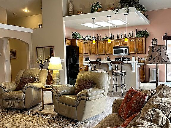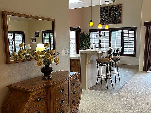 Available for viewing NOW thru June 1st then OFF market for summer. Quiet FULLY FURNISHED TURNKEY 3 bedroom, 2.5 bath, 2100 sq ft, beautiful single level with open floor plan. Located on corner lot with enclosed back/side yards and low maintenance desert landscaping. Desert Springs is a gated 55+ golf course community on leased land. Non smoking home. Main living areas features vaulted ceilings, arches and high decorative platforms. Spacious primary suite includes vaulted ceilings and a private retreat area. Primary bath with double sinks, walk-in shower and soaking tub. Open kitchen with island breakfast bar, pantry and pendant lights. Buyer agents are welcomed