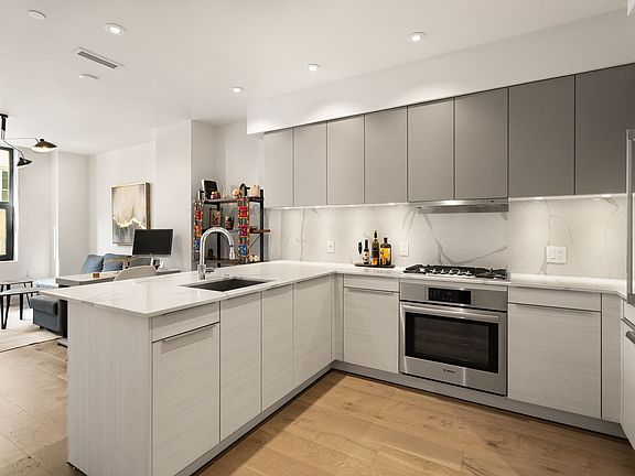 Step inside this meticulously designed condo and be enchanted by the high-end finishes throughout. The spacious chef's kitchen is a culinary enthusiast's delight, featuring top-of-the-line Poggenpohl cabinets, Calcutta quartz countertops, geometric Kraus sinks, quartz backsplashes, and Thermador and Bosch appliances. The Kahrs white oak hardwood floors seamlessly transition into the living area, enhancing the contemporary aesthetic of the space.