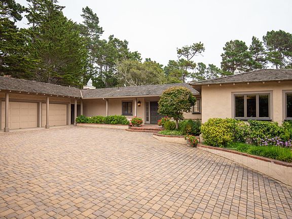 This gated, private residence is perfectly located to enjoy all that Pebble Beach has to offer. Walk to the Lodge and golf links, or meander along Stillwater Cove to enjoy vibrant sunsets and beach strolls. A desirable single-level 4,700 sq ft home with the opportunity to make it your own. Featuring five total bedrooms with four bedrooms each en suite and a half bath in the main house and private attached guest unit with one bedroom and full bathroom. Home includes a 3-car garage, hardwood and limestone floors, wet bar in kitchen, separate dining room and three fireplaces to cozy up to. Designed to wrap around a large courtyard with access from most rooms perfect for entertaining or a quiet place for intimate gatherings. Wonderful terraced gardens and paths surround the home giving a feeling of serenity and seclusion.