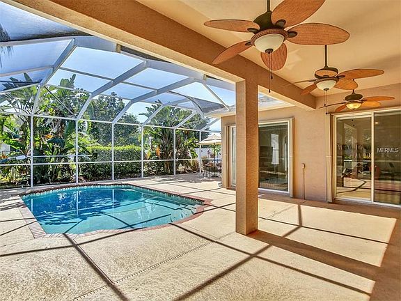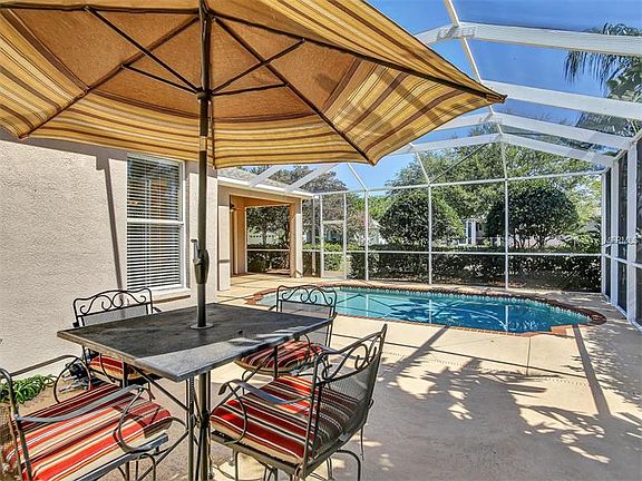 Stunning Executive Pool Home in Ridge Crest. Expect to be impressed with this Contemporary 4 bedroom, 3 bath home on a corner lot. What a great floor plan! It's open and inviting with spectacular views of the pool from almost every room. The 10 foot ceilings, crown moldings, tile flooring and beautiful casings around the sliding doors create a custom feel to the home. An impressive entryway is lushly landscaped. Your formal living and dining room up front can also make a great office and dining room as the current owner shows. You have amazing outdoor living space with the oversized lanai, salt water, solar heated pool, plus extra outdoor dining area all under a large pool enclosure. A chef's delight, the kitchen offers a double oven, lots of counter space, tons of 42 inch cherry wood cabinets, an upgraded stainless refrigerator, designer backsplash, walk in pantry and breakfast bar for five. It opens to the family room with great views of the pool as well. The master suite has another set of sliders leading to the pool deck. The master bath has a jetted tub, dual sinks, separate shower and two large closets. Oversized 2 car garage, inside laundry room, irrigation system, gutters, storm shutters. This house has it all! AC replaced in 2015. Call today!