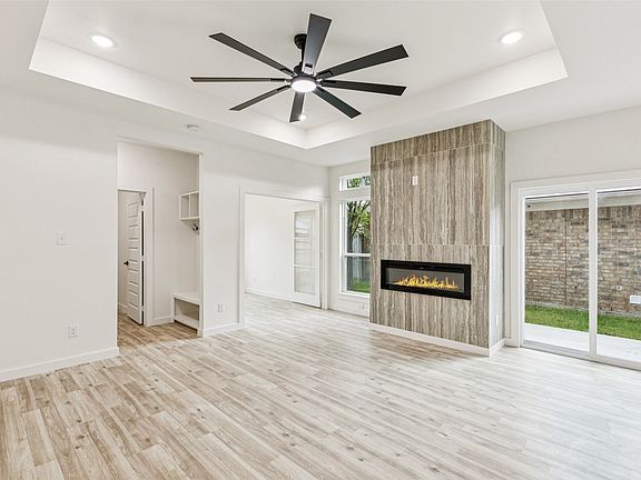 Stately fireplaceDedicated home officeTwo-car garageWall of windowsSpacious open floor planModern designNatural light